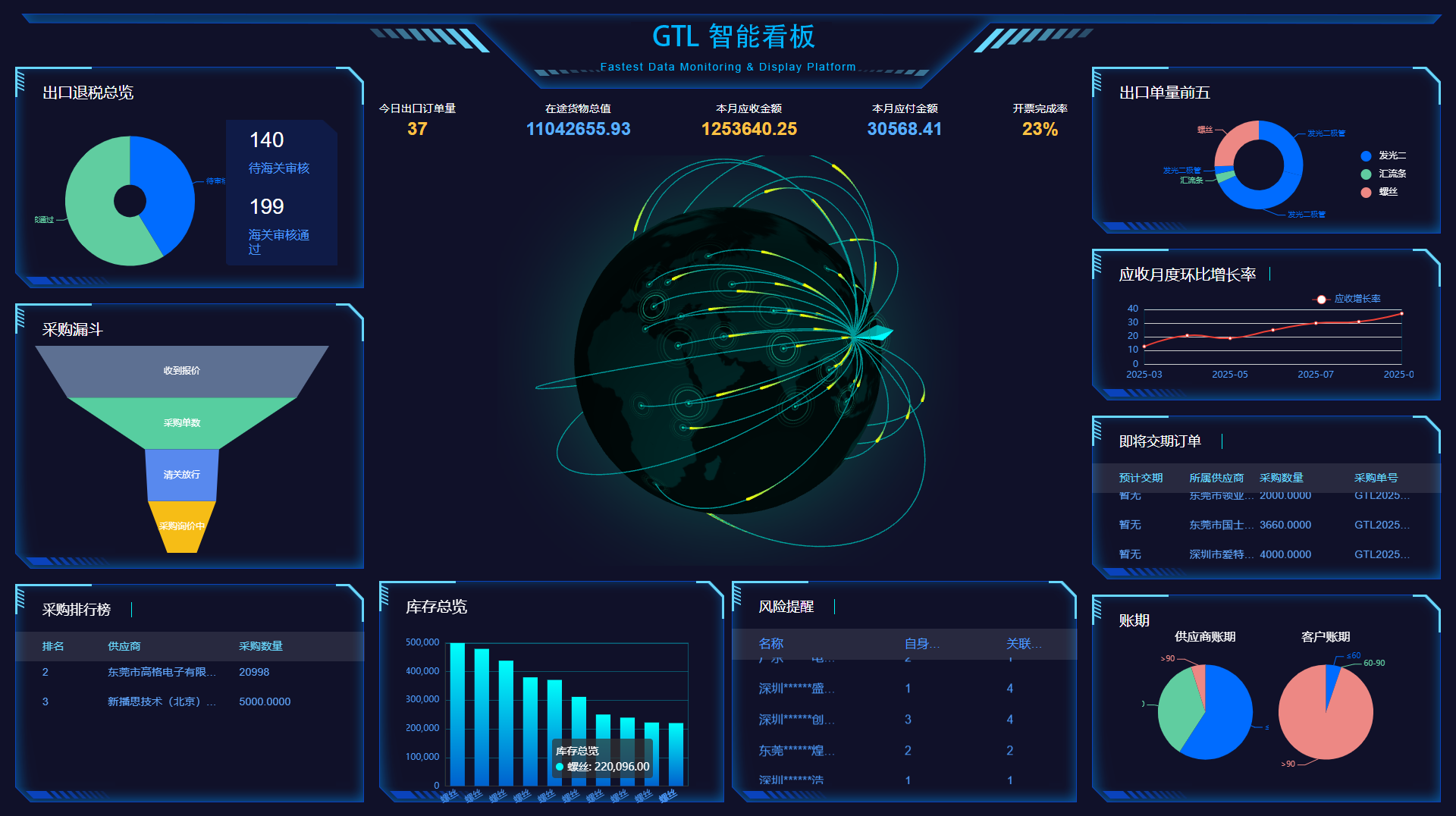 自主研发供应链管理系统,集成供应商管理、采购跟踪、仓储监控、关务办理、财务结算、税务管理等功能模块。支持实时查看询报价状态、采购量、库存动态、通关进度等数据,全流程线上化操作(如对账开票、外汇结算),帮助供应链上下游企业降本提效。